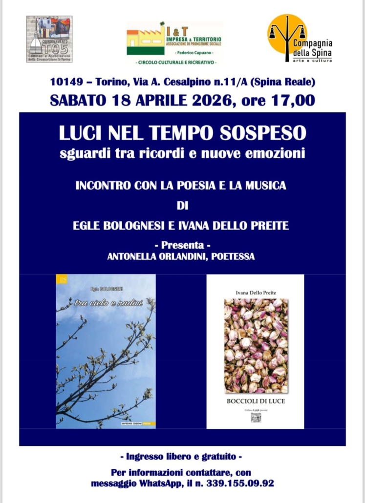 La poesia grande protagonista in questo evento con i libri delle due poetesse Bolognesi e Dello Preite. “Luci nel tempo sospeso” tra musica, rime ed emozioni. Alle 17 di sabato 18 aprile, in via Cesalpino, a Torino.