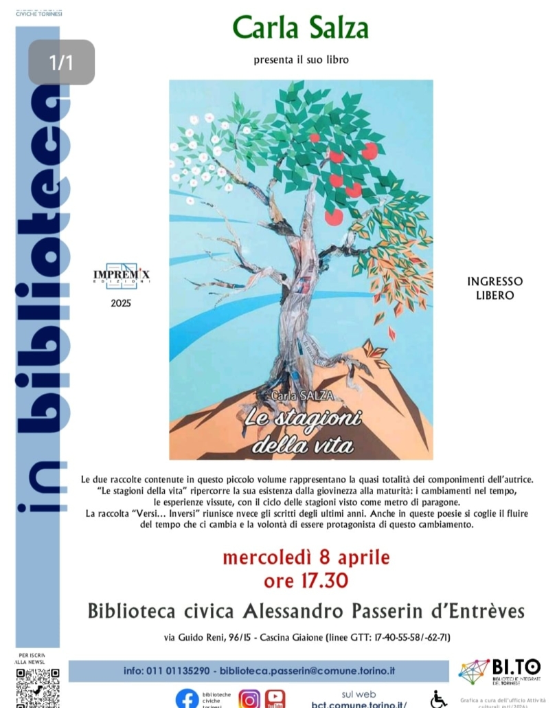 Nella biblioteca Passerin D’Entreves, l’otto aprile alle 17,30, Carla Salza presenta la sua ultima sillege che raccoglie le poesie di una vita: emozioni, ricordi, passioni si possono sfiorare attraverso rime delicate condivise con generosità dall’autrice.