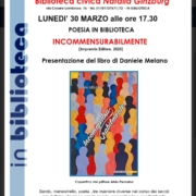 Un pomeriggio di poesia nell’accogliente spazio della biblioteca Ginzburg con Daniele Melano che presenta il suo libro “Incommensurabilmente”. Appuntamento per le ore 17,30 in via Lombroso 16.