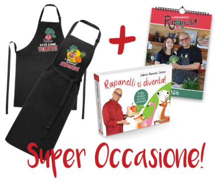 Acquistando insieme al bellissimo calendario di Rapanello, uno dei suoi fantastici grembiuli e il libro “Rapanelli si diventa!”, riceverai uno sconto di 2 euro sul totale!