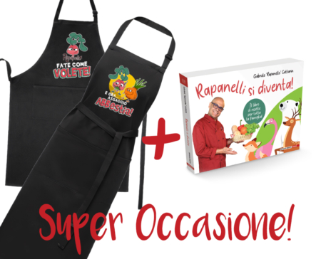 Acquistando uno dei bellissimi grembiuli di Rapanello insieme al libro “Rapanelli si diventa!”, riceverai i relativi gadget: il segnalibro, 4 cartoline con bellissime illustrazioni, e un kit con grembiule e cappello da cuoco per i tuoi bambini (con il libro)!