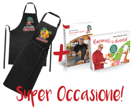 Acquistando insieme ad uno dei suoi fantastici grembiuli i 2 libri “Rapanelli si diventa” e “Fate come volete”, riceverai uno sconto di 2 euro sul totale!
